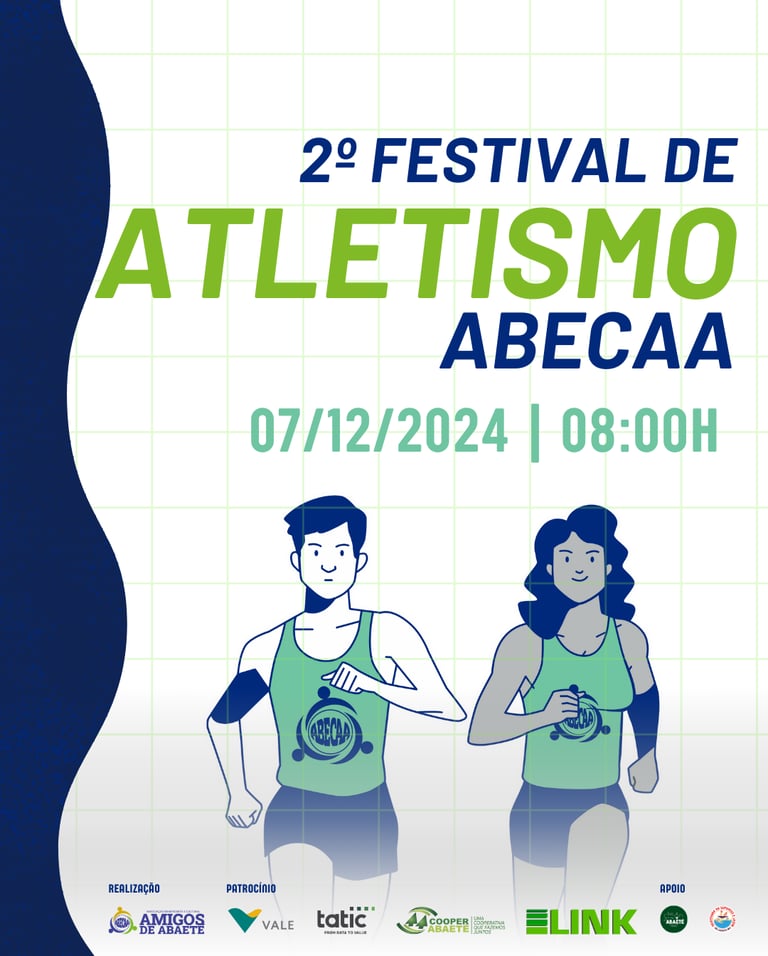 Queremos expressar nossa imensa gratidão aos patrocinadores que tornam possível a realização do 2º Festival de Atletismo ABECAA. Agradecemos à Vale, Link, Tatic Digital, Cooperabaeté, à Prefeitura Municipal de Abaeté, e à Secretaria de Esporte e Lazer de Abaeté – SEL. Seu apoio inestimável contribui significativamente para a promoção do esporte e do desenvolvimento dos jovens atletas na comunidade. Sem a colaboração destes parceiros, o festival não seria uma realidade.