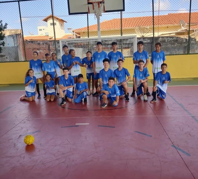 Aulas gratuitas de handebol para crianças, com apoio da empresa Link. Além das aulas, os alunos ganham uniformes completos para a prática esportiva.